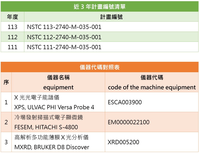 致謝中英文參考範本、近3年計畫編號清單與儀器代碼對照表如下: